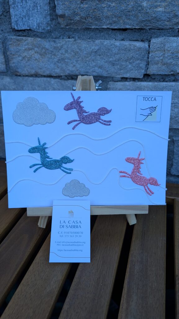 Cartolina tattile e l'unicorno adattato ai bisogni dei bambini con disabilità