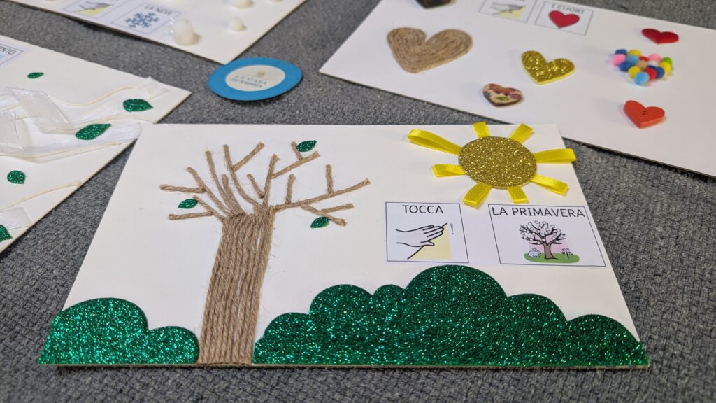 Ad esempio, per la cartolina “Tocca la primavera” il tronco degli alberi è fatto con fili di corda intrecciati, il sole splende grazie alla gomma EVA glitterata e i dettagli in rilievo stimolano l’esplorazione sensoriale.
