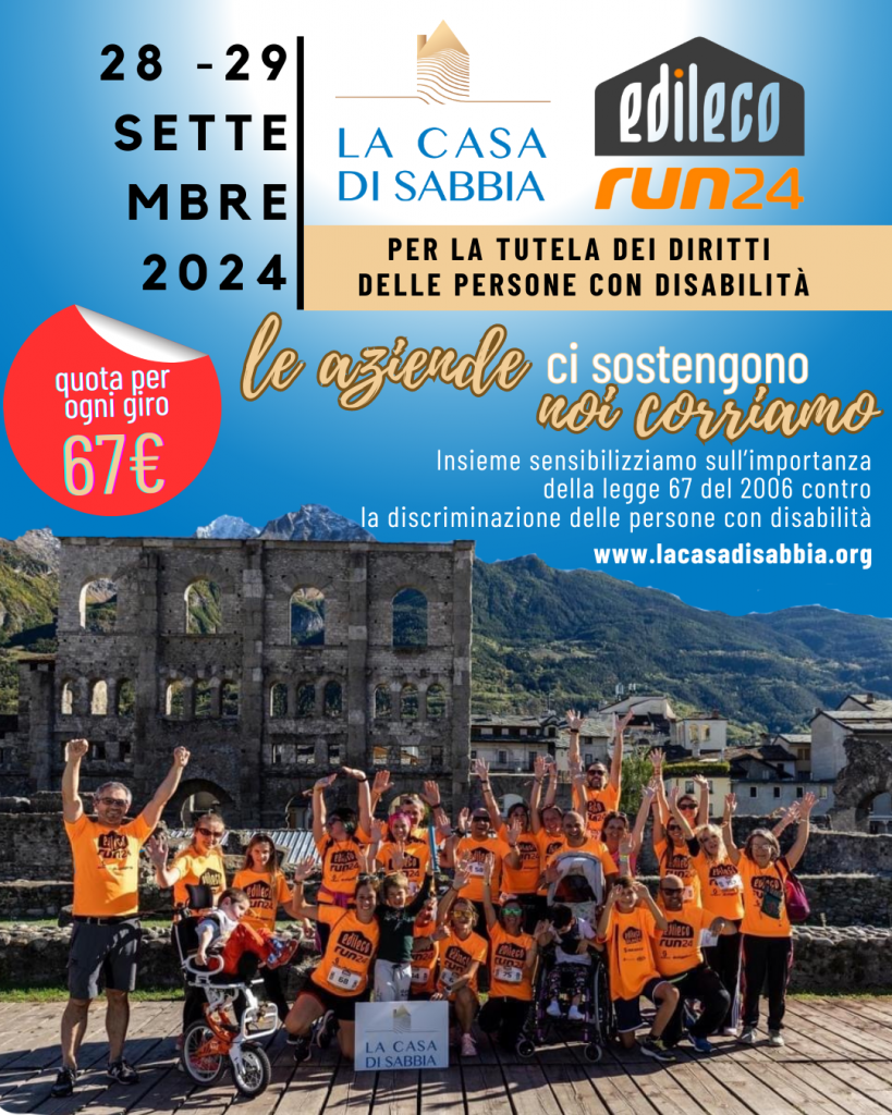 Nel 2024, La casa di sabbia parteciperà nuovamente alla corsa di EdilEcoRun con la propria squadra La casa di sabbia Pink InRun composta da soci, donatori, familiari di persone con disabilità, sostenitori e volontari. Avremo anche un gazebo in Piazza Chanoux per presentare le nostre attività e il nostro impegno verso la disabilità gravissima dei bambini.